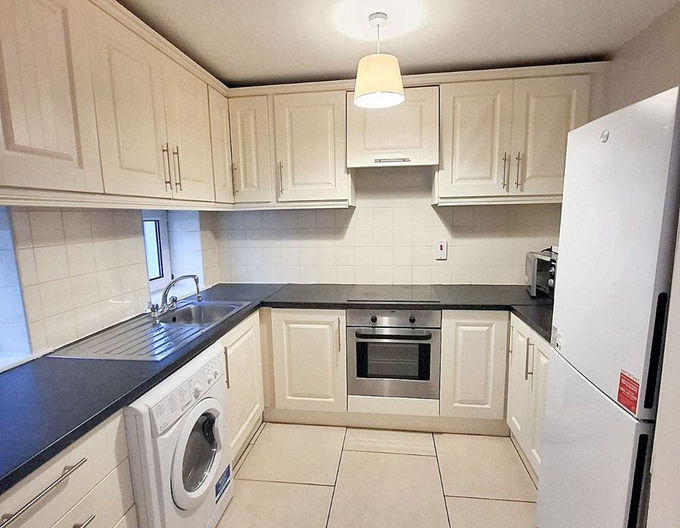 The kitchen is fitted with ample wall and floor units, tiled floor and walls, and comes equipped with all necessary appliances.